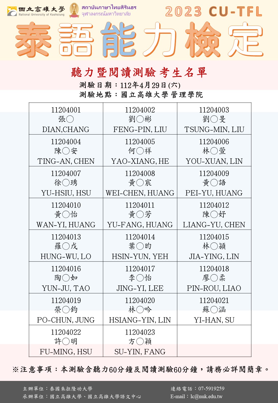 【公告】2023高雄場 泰語能力檢定(CU-TFL)考生名單