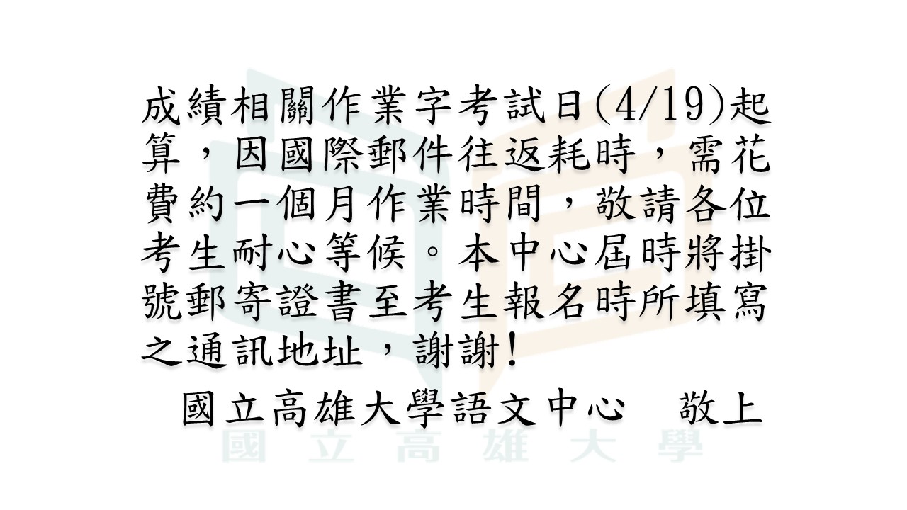 【公告】2025高雄場 泰語檢定(CU-TFL)成績公告相關事宜