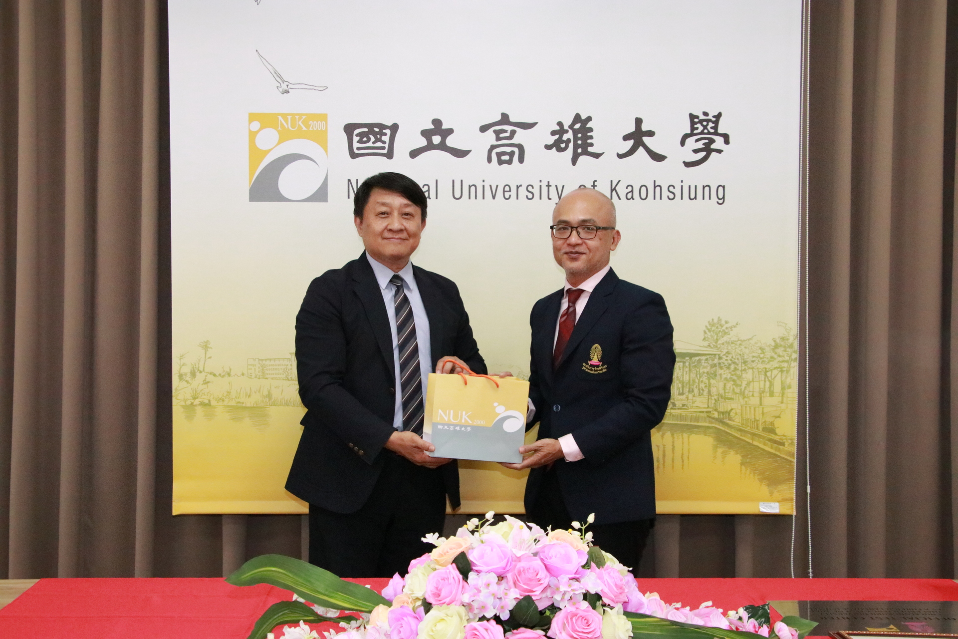 朱拉隆功大學詩琳通泰語中心副主任Asst. Prof. Manasikarn Hengsuwan, Ph.D.以及行政主任 Mr. Kachen Tansiri, Ph.D.專程來台拜會與頒授,高雄大學校長陳啓仁代表接受以彰顯重視,副校長吳行浩、國際處國際交流組長馬瑜嬪、東語系助理教授潘婉玲與會見證。