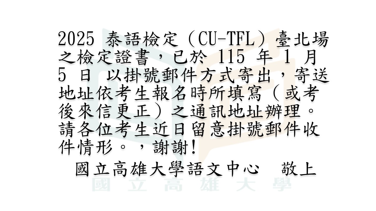 【公告】 2025 泰語檢定(CU-TFL)臺北場證書寄送通知